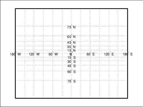 'meridianlabel','on','parallellabel','on')Ниже показаны решетка и рамка для проекции карты по умолчанию.