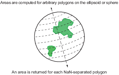 Учитывая достаточные данные, areaint функция является наилучшим методом определения областей сложных многоугольников, таких как континенты, облачность и другие природные или производные элементы. Расчеты в этой функции используют сферическое предположение о Земле. Для несферических эллипсоидов данные широты преобразуются во вспомогательную авторитарную сферу.