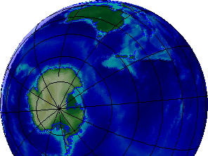 axesm('globe','galt',0) gridm('glinestyle','-') load topo60c geoshow(topo60c,topo60cR,'DisplayType','texturemap') demcmap(topo60c) camlight material(0.6*[ 1 1 1]) plat = -50; plon = 160; tlat = -10; tlon = 130; camtargm(tlat,tlon,0) camposm(plat,plon,1) camupm(tlat,tlon) set(gca,'CameraViewAngle',75) land = shaperead('landareas.shp','UseGeoCoords',true); linem([land.Lat],[land.Lon]) axis off