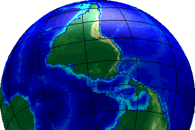 axesm('globe','galt',0) gridm('glinestyle','-') load topo60c geoshow(topo60c,topo60cR,'DisplayType','texturemap'); demcmap(topo60c) lightm(-80,-180); material(0.6*[ 1 1 1]) plat = 10; plon = -65; tlat = -30; tlon = -70; camtargm(tlat,tlon,0); camposm(plat,plon,3); camupm(tlat,tlon); camva(20) set(gca,'CameraViewAngle',30) land = shaperead('landareas.shp','UseGeoCoords',true); linem([land.Lat],[land.Lon]) axis off