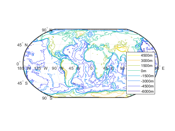 Загрузите растровые данные отметки и объект ссылки на географические ячейки. Создайте объект оси карты для мира. Отображение контурного графика с использованием растровых данных. Затем создайте легенду в правом нижнем углу карты. Задайте отметки горизонталей как метры.