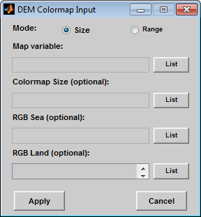 Поле редактирования RGB Sea используется для определения цветов для данных с отрицательными значениями. Фактические морские цвета сформированной карты цветов интерполируются из этой матрицы. Эта запись может быть матрицей любой длины (n-by-3) Матрица карты цветов текущего рисунка может быть использована путем ввода 'window' в этом поле. demcmap функция предоставляет цвета моря по умолчанию, которые используются, если эта запись оставлена пустой.