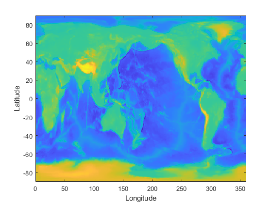 grid2image(Z,R) отображает обычную сетку данных Z как изображение. Изображение отображается в незапроектированном виде, с долготой x и широтой y, что приводит к значительному искажению от экватора. Z может быть M-by-N или M-by-N-by-3 и может содержать double, uint8, или uint16 данные. Сетка привязана к широте-долготе R, который может быть объектом географической растровой ссылки, ссылочным вектором или ссылочной матрицей.