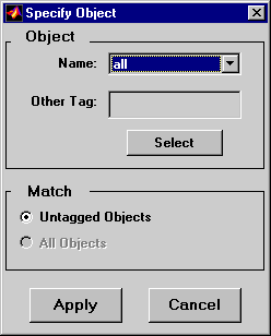 Элементы управления объектами используются для выбора типа объекта или тега. Раскрывающееся меню «Имя» используется для выбора из списка предопределенных объектов. Поле редактирования «Другая марка» используется для указания марки объекта, не указанной в раскрывающемся меню «Имя». Нажатие кнопки «Выбрать» приводит к открытию диалогового окна «Выбор объекта», в котором отображаются только отображаемые в данный момент объекты для выбора.