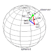 lat0 и lon0 - геодезические координаты точки обзора на опорном сфероиде, spheroid. h0 определяет геодезическую высоту точки обзора в пространстве над сфероидом. az и tilt аргументы определяют направление вида (линию визирования) как угол азимута, измеренный по часовой стрелке от севера, и угол наклона. Эти измерения показаны на следующем рисунке.