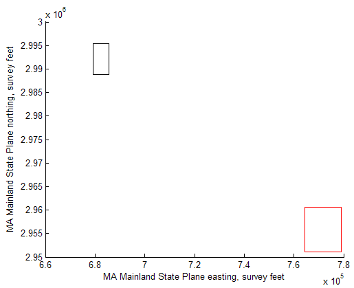 xlabel('MA Mainland State Plane easting, survey feet')