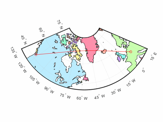 [zi,ri,lat,lon] = mapprofile(___,'trackmethod','interpmethod') управление используемыми методами интерполяции. Допустимые методы дорожки: 'gc' для дорожек большого круга между ППМ, и 'rh' для линий румба. Допустимыми методами интерполяции в матрице являются 'bilinear' для линейной интерполяции, 'bicubic' для кубической интерполяции, и 'nearest' для интерполяции ближайшего соседа. Если опущено, 'gc' и 'bilinear' предполагается.