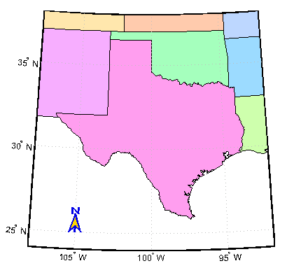 northarrow('latitude',25,'longitude',-105,'linewidth',1.5);
