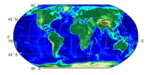 load topo60c [topo60c,topo60cR] = geocrop(topo60c,topo60cR,[-90 90],[-180,180]); [lat,lon] = geographicGrid(topo60cR); worldmap world surfacem(lat,lon,topo60c) demcmap(topo60c)