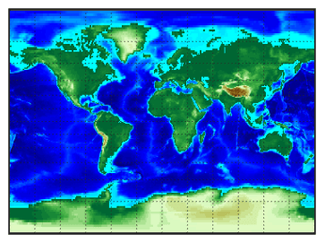 load topo60c axesm miller axis off framem on gridm on [topo60c,topo60cR] = geocrop(topo60c,topo60cR,[-90 90],[-180,180]); [lat,lon] = geographicGrid(topo60cR); surfm(lat,lon,topo60c) demcmap(topo60c)