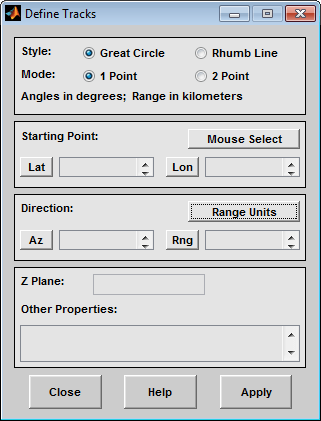 Элементы управления «Направление» используются только для режима с одной точкой. Кнопка Единицы диапазона (Range Units) открывает диалоговое окно Определить единицы диапазона (Define Range Units), в котором можно изменить единицы диапазона и нормирующий геоид. Поле редактирования Az используется для ввода азимута, который задает начальное направление пути от начальной точки. Азимут измеряется в градусах по часовой стрелке от заданного севера. Поле редактирования Rng используется для указания диапазона дорожки в соответствующих единицах. Если запись диапазона опущена, рисуется полная дорожка. При вводе азимута и данных диапазона для нескольких дорожек векторы значений, заключенные в скобки, вводятся в каждое поле редактирования. Нажатие кнопки Az или Rng вызывает расширенное поле редактирования для этой записи, которое полезно для ввода длинных векторов.
