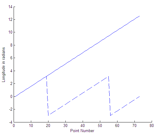 lon = wrapToPi(deg2rad(0:10:720)); unwrappedlon = unwrapMultipart(lon); figure; hold on plot(lon,'--') plot(unwrappedlon) xlabel 'Point Number' ylabel 'Longitude in radians'