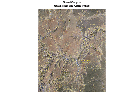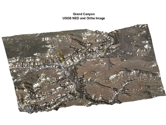 figure usamap(latlim,lonlim) framem off mlabel off plabel off gridm off geoshow(double(Z),R,'DisplayType','surface','CData',A); daspectm('m',1) title({'Grand Canyon','USGS NED and Ortho Image'}, ... 'FontSize',8); axis vis3d