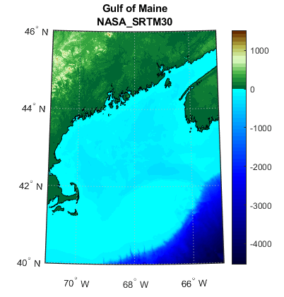 figure worldmap(Z,R) geoshow(Z,R,'DisplayType','texturemap') demcmap(double(Z)) contourm(double(Z),R,[0 0],'Color','k') colorbar title ({'Gulf of Maine',srtm.LayerTitle}, ... 'Interpreter','none')