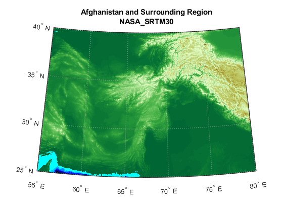 figure worldmap('Afghanistan') geoshow(ZA,RA,'DisplayType','texturemap') demcmap(double(ZA)) title({'Afghanistan and Surrounding Region',srtm.LayerTitle}, ... 'Interpreter','none');