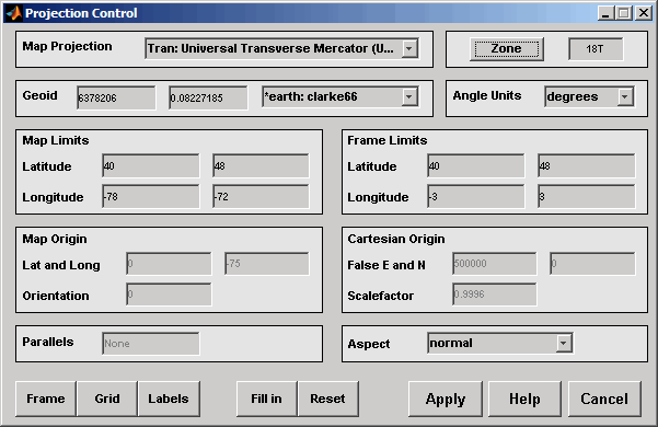 axesmuiВ поле Map Projection установлено значение cyln: Universal Transverse Mercator (UTM).