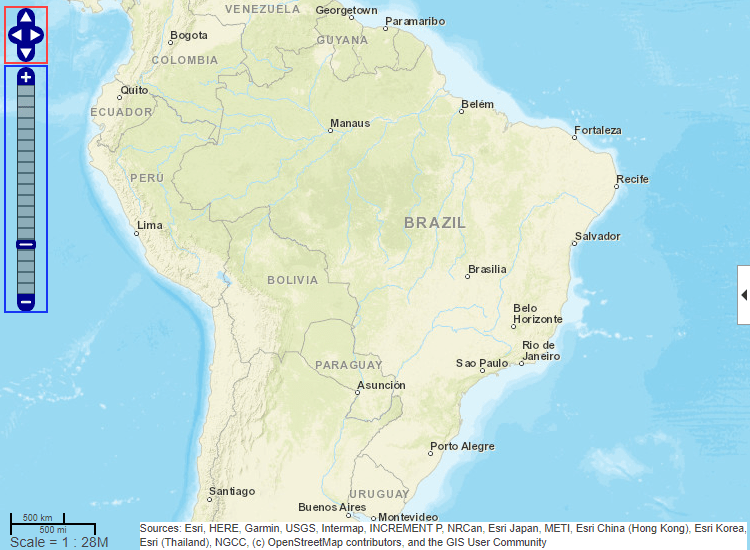 Например, откройте веб-карту с помощью webmap функция. По умолчанию webmap отображает всю карту, масштабированную по размеру окна и центрированную по широте и долготе [0 0]. На этом рисунке показан инструмент панорамирования, выделенный красным цветом, и инструмент зумирования, выделенный синим цветом. Используйте инструменты для центрирования карты по Бразилии.