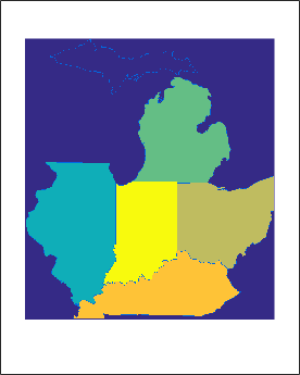 В этом примере показано, как использовать encodem с начальными точками, найденными с помощью getseeds функция для заполнения нескольких многоугольников после того, как они будут привязаны к сетке. Пример извлекает данные для Индианы и окружающих ее штатов, а затем удаляет нежелательные области этих полигонов с помощью maptrimp .