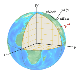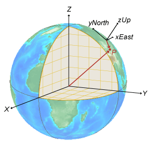 В отличие от функций преобразования координат, таких как ecef2enu, функции векторного преобразования, такие как ecef2enuv не требуется указывать ссылочный сфероид или эллипсоидальную высоту локального начала координат. Геодезическая широта и долгота локального начала координат достаточны для определения ориентации осей uEast, vNorth и wUp.