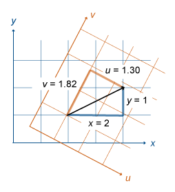 Например, на этом изображении показано преобразование вектора 2-D из системы x-y в систему u-v. Вектор имеет компоненты x = 2 и y = 1 в системе x-y, а компоненты u = 1,30 и v = 1,82 в системе u-v. Компоненты вектора различны, но в каждой системе величина вектора равна 2,24 единицы.