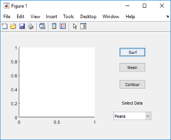 Запустите приложение, введя simple_gui2 в командной строке. Код инициализации приводит к отображению значения по умолчанию peaks данные с помощью surf функция, делающая пользовательский интерфейс похожим на этот.
