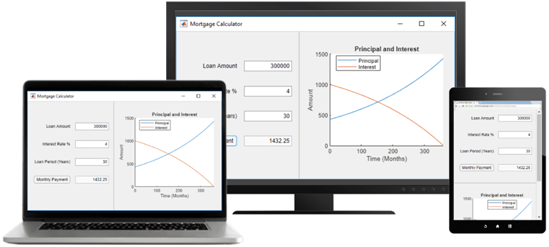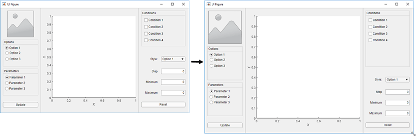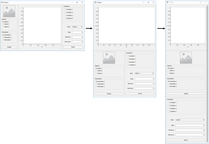 Приложения с автоматической перекомпоновкой расширяют существующие варианты поведения при автоматическом изменении размеров, которые включены по умолчанию во всех приложениях App Designer. Эти приложения обнаруживают и адаптируются к доступному размеру экрана при первом отображении. Как 2, так и 3-панельные приложения имеют большую панель гибкого размера, предназначенную для визуализации, как графики. По мере изменения размера приложения большая панель растет или сокращается в зависимости от доступного пространства.