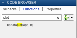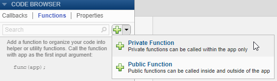 Управление вспомогательными функциями в обозревателе кода аналогично управлению обратными вызовами. Можно изменить имя вспомогательной функции, дважды щелкнув имя на вкладке «Функции» браузера кода и введя новое имя. App Designer автоматически обновляет все ссылки на функцию при изменении ее имени.