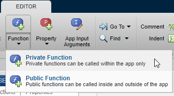 Разверните раскрывающееся меню в нижней части кнопки «Функция» на вкладке «Редактор». Выберите Частная функция (Private Function) или Общедоступная функция (Public Function).