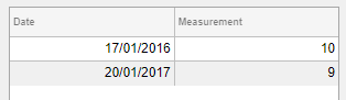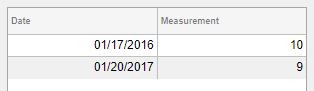 fig = uifigure; dates = datetime([2016,01,17; 2017,01,20],'Format','MM/dd/uuuu'); m = [10; 9]; tdata = table(dates,m,'VariableNames',{'Date','Measurement'}); uit = uitable(fig,'Data',tdata);