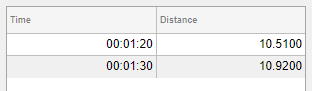 fig = uifigure; mtime = duration([0;0],[1;1],[20;30]); dist = [10.51; 10.92]; tdata = table(mtime,dist,'VariableNames',{'Time','Distance'}); uit = uitable(fig,'Data',tdata);