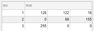 n = [1;2;3]; rgbs = [128 122 16; 0 66 155; 255 0 0]; tdata = table(n,rgbs,'VariableNames',{'ROI','RGB'})