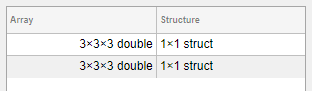 Нескалярные значения отображаются в приложении так же, как и в окне команд. Например, этот массив таблицы содержит 3-D массива и struct массивы.