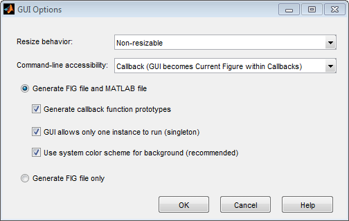 Выберите Generate FIG-file и MATLAB file (Генерировать файл FIG и файл MATLAB) в диалоговом окне Опции GUI (GUI Options), если требуется, чтобы GUIDE создавал как файл FIG, так и файл пользовательского кода (по умолчанию). После выбора этого параметра можно выбрать любой из следующих элементов в рамке для настройки кода пользовательского интерфейса: