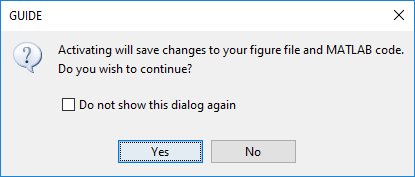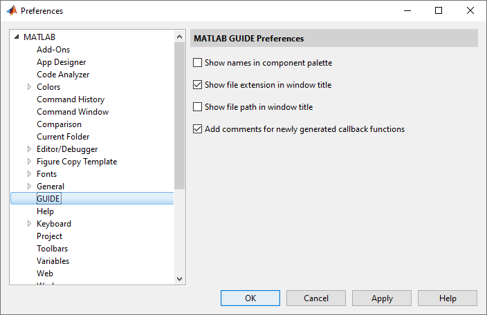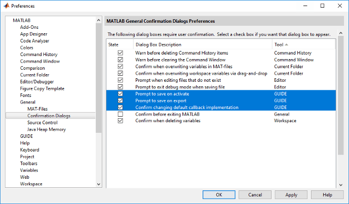 В диалоговом окне «Установки» выберите MATLAB > General > Confirmation Dialogs для доступа к настройкам подтверждения GUIDE. Ищите слово GUIDE в столбце «Инструмент».