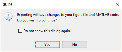В редакторе компоновки при выборе меню «Файл» > «Экспорт в MATLAB-файл» появляется диалоговое окно, информирующее о предстоящем сохранении и позволяющее выбрать, следует ли продолжить.