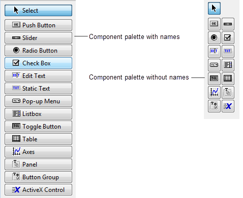 Отображение значков и имен в палитре компонентов, как показано ниже. Если этот флажок не установлен, только значки отображаются в двух столбцах с подсказками.