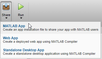 В App Designer выберите вкладку Конструктор. Затем выберите Поделиться > Приложение MATLAB.