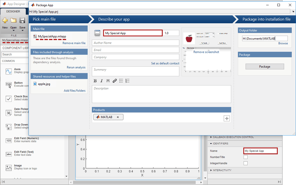 Щелкните Пакет, чтобы создать .mlappinstall для предоставления общего доступа пользователям. В дальнейшем при повторном нажатии кнопки Package App на панели инструментов App Designer в диалоговом окне Package App открывается последнее измененное приложение. .prj для файла MLAPP.