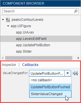 Затем выполните обратный вызов совместно с полем редактирования. В обозревателе компонентов щелкните правой кнопкой мыши на значке app.LevelsEditField компонент и выберите Callbacks > Select existing callback.... При появлении диалогового окна «Select Callback Function» (Выбор функции обратного вызова) выберите в раскрывающемся меню «Name» (Имя) команду, которая должна быть выбрана в контекстном меню.