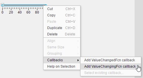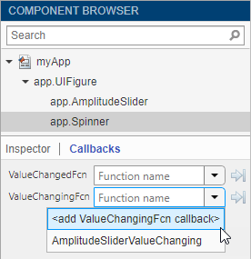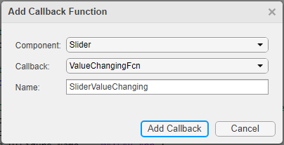 Обратный вызов - укажите свойство обратного вызова. Свойство обратного вызова сопоставляет функцию обратного вызова с определенным взаимодействием. Некоторые компоненты имеют несколько доступных свойств обратного вызова. Например, ползунки имеют два свойства обратного вызова: ValueChangedFcn и ValueChangingFcn. ValueChangedFcn выполняется после того, как пользователь переместит ползунок и отпустит мышь. ValueChangingFcn свойство для одного и того же компонента выполняется повторно, пока пользователь перемещает ползунок.