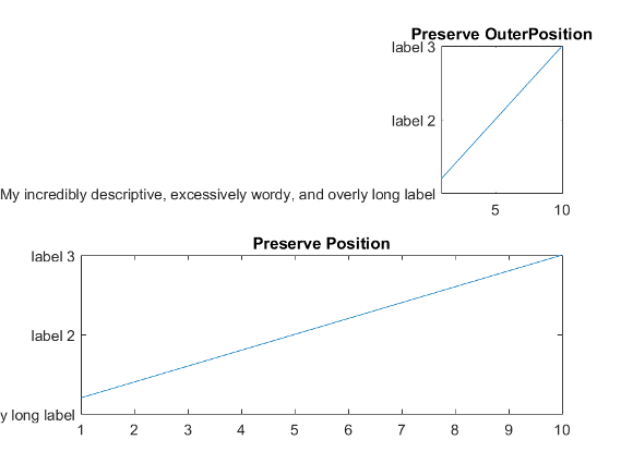 figure; ax1 = axes('Position',[0.13 0.58 0.77 0.34]); ax1.PositionConstraint = 'outerposition'; % R2019b and earlier: ax1.ActivePositionProperty = 'outerposition'; plot(ax1,1:10) title(ax1,'Preserve OuterPosition') yticklabels(ax1,{'My incredibly descriptive, excessively wordy, and overly long label',... 'label 2','label 3'}) ax2 = axes('Position',[0.13 0.11 0.77 0.34]); ax2.PositionConstraint = 'innerposition'; % R2019b and earlier: ax2.ActivePositionProperty = 'position'; plot(ax2,1:10) title(ax2,'Preserve Position') yticklabels(ax2,{'My incredibly descriptive, excessively wordy, and overly long label',... 'label 2','label 3'})