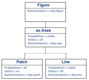 function pickHit f = figure; ax = axes; p = patch(rand(1,3),rand(1,3),'g'); l = line([1 0],[0 1]); set(f,'ButtonDownFcn',@(~,~)disp('figure'),... 'HitTest','off') set(ax,'ButtonDownFcn',@(~,~)disp('axes'),... 'HitTest','off') set(p,'ButtonDownFcn',@(~,~)disp('patch'),... 'PickableParts','all','FaceColor','none') set(l,'ButtonDownFcn',@(~,~)disp('line'),... 'HitTest','off') end