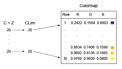 Диапазон отображения управляется CLim имущества Axes объект. Это свойство содержит двухэлементный вектор формы [cmin cmax]. Значение по умолчанию cmin равно наименьшему значению Cи значение по умолчанию cmax является наибольшим значением C. В этом случае CLim является [-20 20] из-за диапазона C отражает диапазон Z.