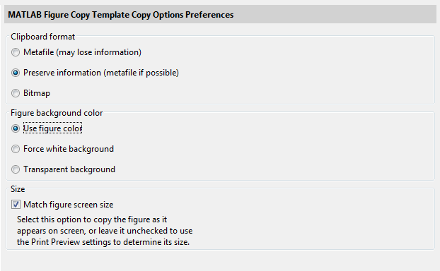 Прозрачный фон - копирование фигуры с прозрачным фоном. Чтобы использовать программную альтернативу, установите Color свойство для фигуры в 'none' и InvertHardcopy свойство для 'off' перед копированием. Форматы Metafile и PDF поддерживают прозрачность. Форматы растровых изображений не поддерживают прозрачность.
