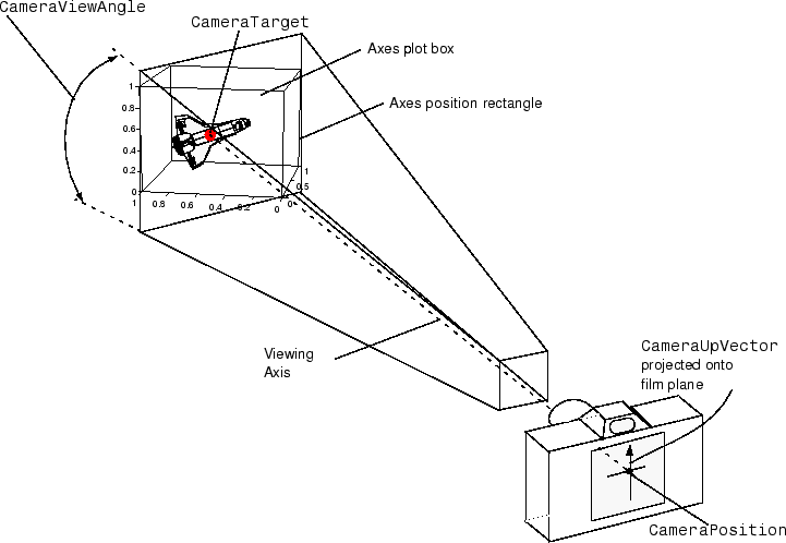 При просмотре графических объектов, отображаемых в осях, просматривается сцена из определенного места в пространстве, которое имеет определенную ориентацию относительно сцены. MATLAB ® Graphics предоставляет функциональные возможности, аналогичные функциям камеры с зуммированным объективом, что позволяет управлять видом сцены, созданной MATLAB.