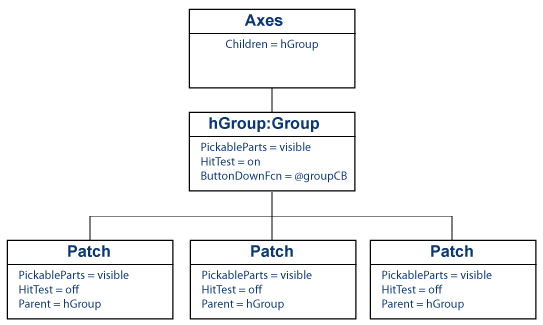 function pickPatch figure x = [0 1 2]; y = [0 1 0]; hGroup = hggroup('ButtonDownFcn',@groupCB); patch(x,y,'b',... 'Parent',hGroup,... 'HitTest','off') patch(x+2,y,'b',... 'Parent',hGroup,... 'HitTest','off') patch(x+3,y,'b',... 'Parent',hGroup,... 'HitTest','off') end