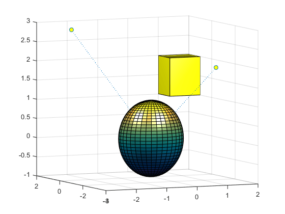 % Create a sphere sphere(36); axis([-3 3 -3 3 -3 3]) hold on % Create a cube fac = [1 2 3 4;2 6 7 3;4 3 7 8;1 5 8 4;1 2 6 5;5 6 7 8]; vert = [1 1 1;1 2 1;2 2 1;2 1 1;1 1 2;1 2 2;2 2 2;2 1 2]; patch('faces',fac,'vertices',vert,'FaceColor','y'); % Add lights light('Position',[1 3 2]); light('Position',[-3 -1 3]); hold off