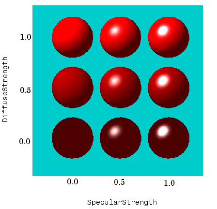 Можно управлять величиной зеркального и диффузного отражения от поверхности объекта, задав SpecularStrength и DiffuseStrength свойства. На этом рисунке показаны различные настройки.