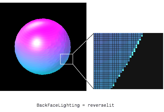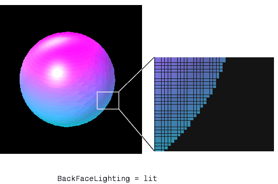 Также можно использовать BackFaceLighting для удаления краевых эффектов для замкнутых объектов. Эти эффекты возникают, когда BackFaceLighting имеет значение reverselit и пикселы вдоль края замкнутого объекта освещаются так, как будто их нормали вершин обращены к камере. Это создает неправильно освещенный пиксель, потому что пиксель виден, но действительно обращен от камеры.