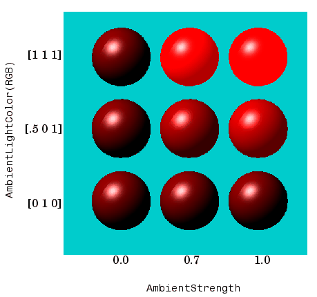 Зеленый [0 1 0] внешний свет не влияет на сцену, поскольку в зеленом свете отсутствует красный компонент. Однако цвет, определяемый значениями RGB [.5 0 1], имеет красную составляющую, поэтому он способствует свету сферы (но меньше, чем белый [1 1 1] окружающий свет).